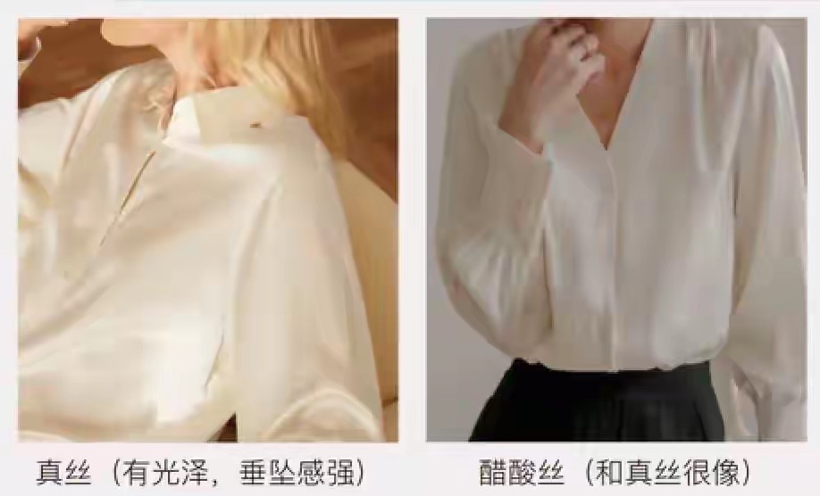 如下面这种“真丝面料”和“醋酸丝面料”,来和真丝真的很像,但懂行的人一眼就能看出它的区别,真丝面料看上去会更有光泽感,垂坠感也会更强。