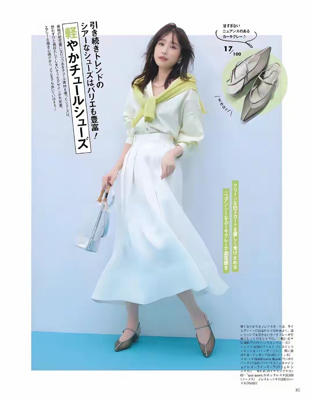 想让自己看起来更有活力,你还可以选择浅牛油果色的衬衫搭配上白色的高腰收腰款伞状半身裙,脚上穿了一双浅口的粗跟低跟单鞋就够,在肩膀上,再加上一款牛油果色的针织衣服,这样能达到一个点缀的效果,让你的造型层次感更分明,色彩也比较修饰肤色,让你显白显嫩更显年轻。