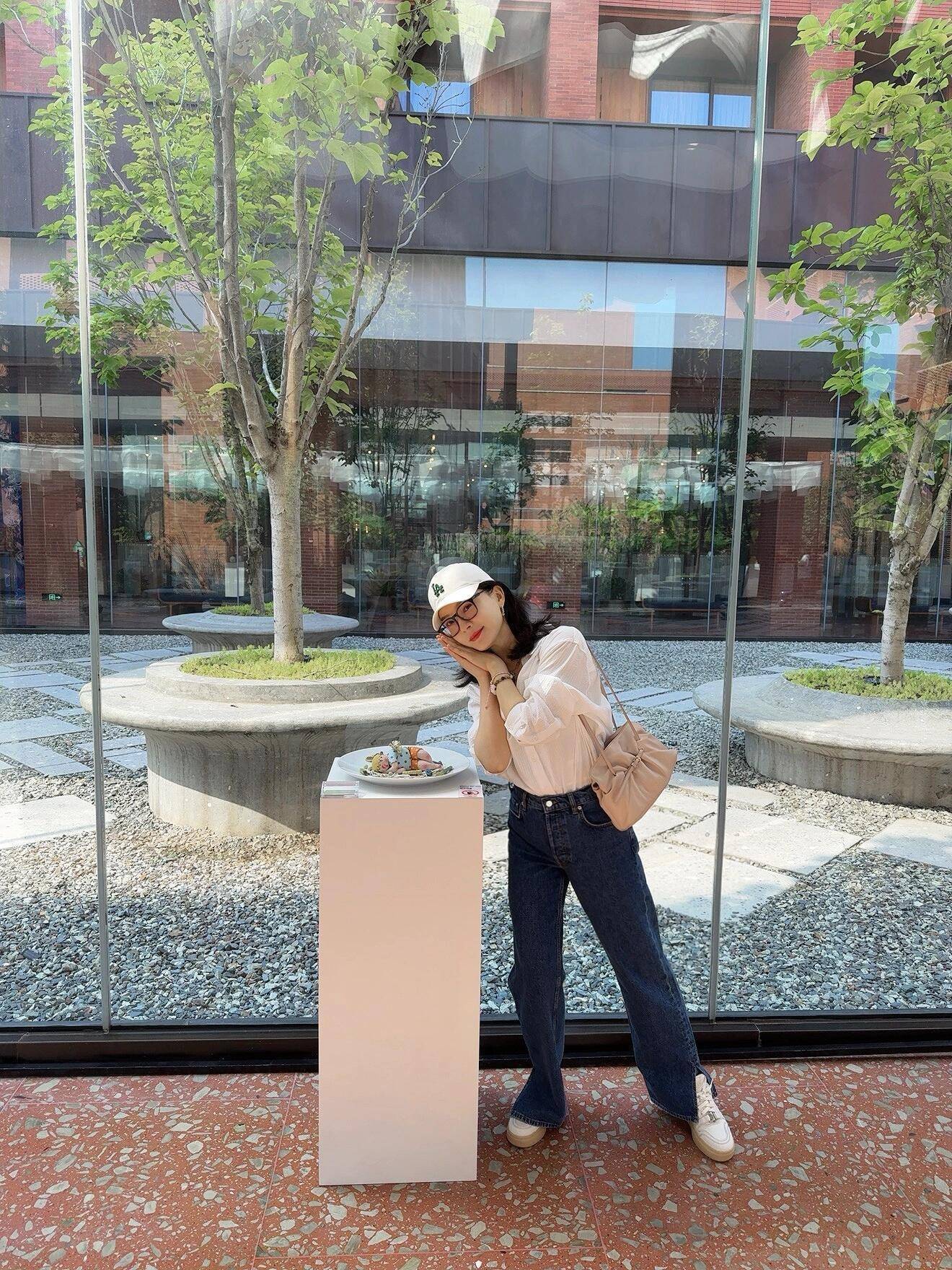 “陈数”就直接选择了白色衬衫,搭配上蓝色牛仔开叉直筒裤,脚上穿的一双白色的小板鞋,头上戴了一顶白色的棒球帽,休闲感十足,不管穿去上班或者是出门逛街都完全没有任何问题。