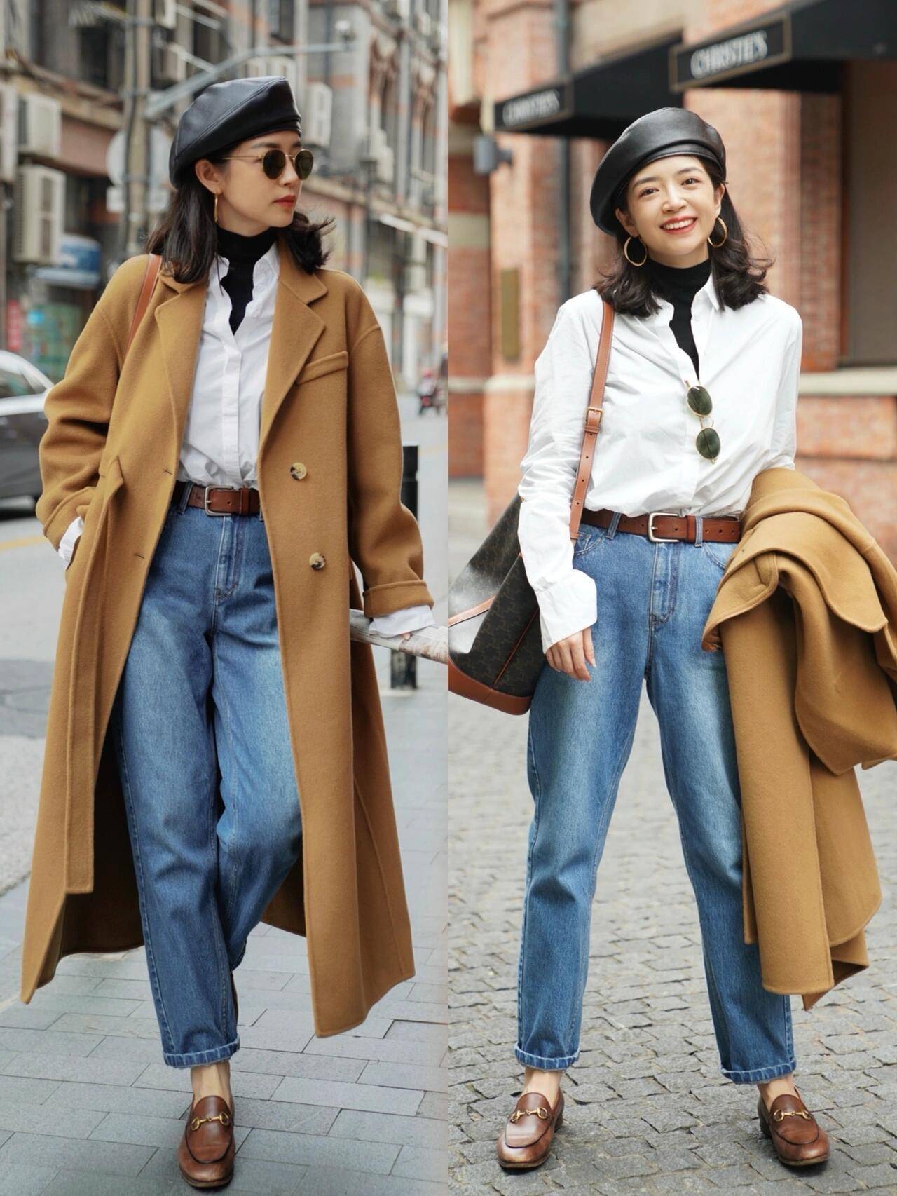 在北方城市生活的你,天气已经开始转凉,这个时候可以用叠加的穿搭方式,例如下面用一件白色衬衫叠穿黑色针织衫,加上一条蓝色牛仔裤,脚上穿的棕色的乐福鞋,腰间再勒上驼色的腰带,轻松提升你的腰线比例。