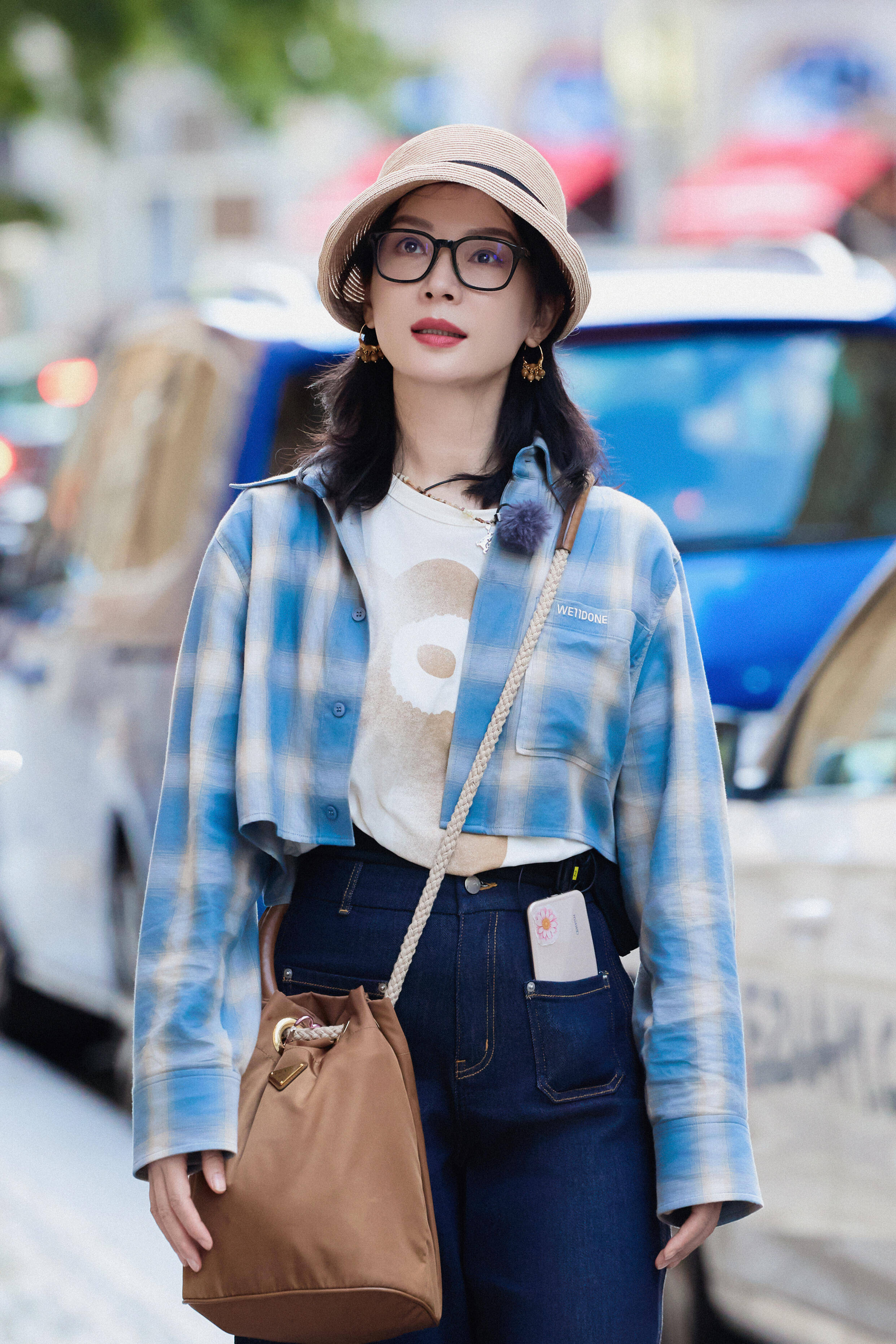 我们还可以采用“上短下长”的搭配方式,能更好的提升我们的腰线,例如,陈数就用了格纹的短款衬衫,内搭印花短袖T恤,加上天生就拥有时尚元素的蓝色牛仔长裤,再戴上一顶小草帽,这样的搭配出门旅游拍照非常出片,氛围感直接拉满。
