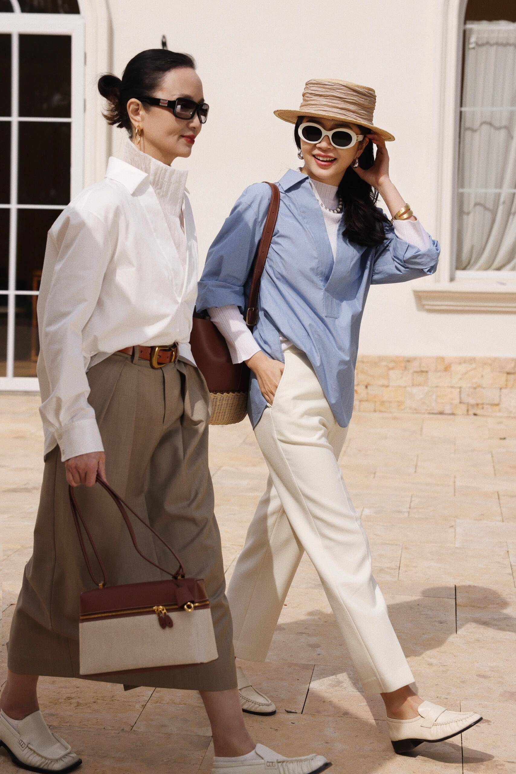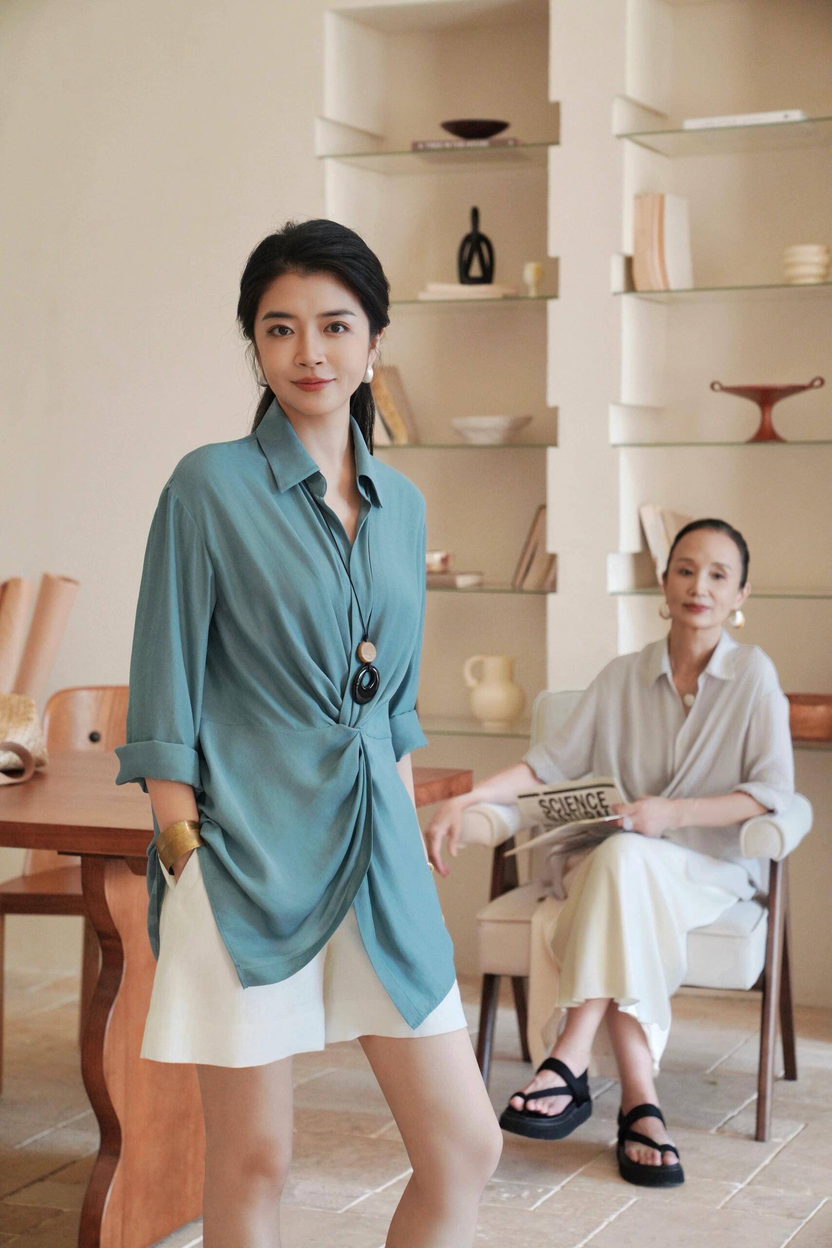 接着咱们来看一下三木时尚博主,这对母女的穿搭,三木时尚博主直接选择了一件真丝面料的蓝色衬衫,上衣搭配上白色的百慕大短裤,这样下半身失踪的穿搭技巧,轻松的展现出她大长腿的优势。